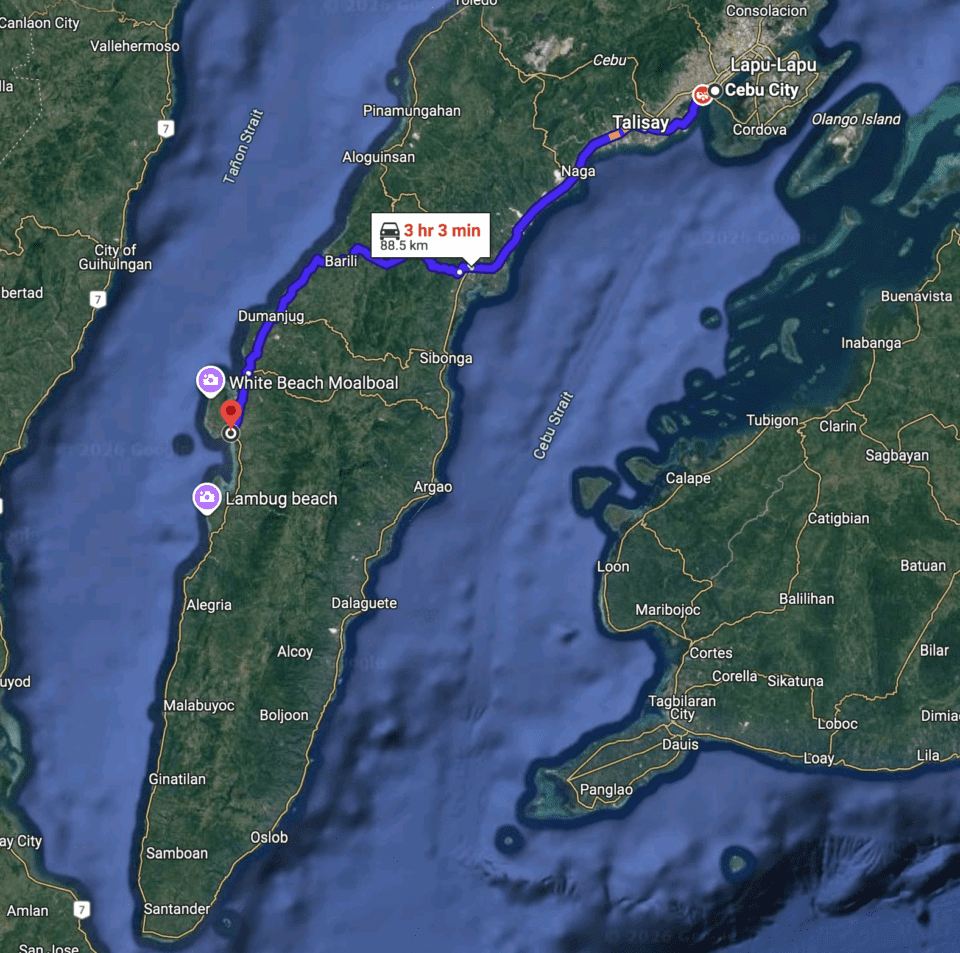 | Duration | The transfer from Cebu to Moalboal takes approximately 3 to 4 hours. |